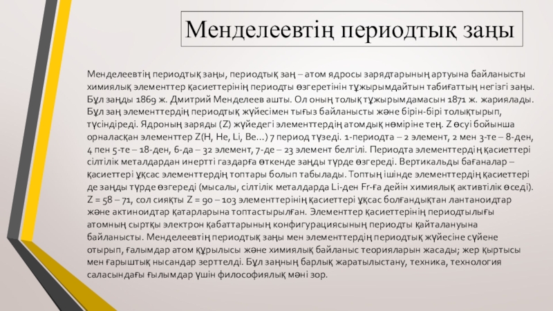 Д. И. Менделеев егер элементтерді ең жеңіл – сутегінен бастапең ауыр – уранға дейін олардың атомдық салмағының өсуі реті бойынша орналастырса, сол кезде белгілі болған 63 химиялық элементтің қасиеттері периодты түрде қайталайтындығын ашты. Бұл заңдылық табиғи заңдылықтарды анықтаған және осы жаңалық ашылғанға дейін химиялық элементтер әлемінде болған шатасушылықты ретке келтірген периодты системаға негіз болды.