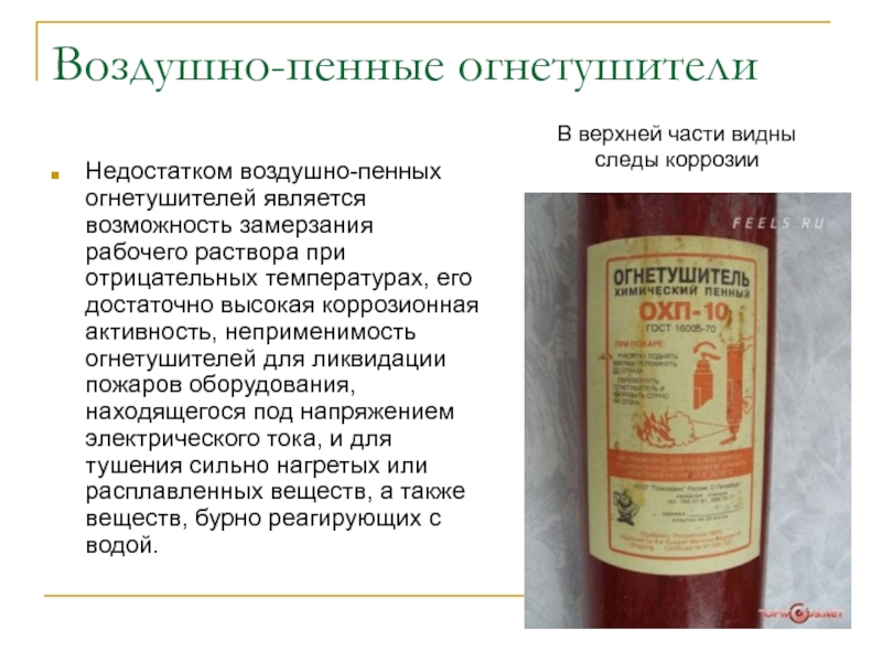 снижение эффективности огнетушителя при отрицательных температурах, что связано со значительным изменением величины давления паров диоксида углерода при изменении температуры.