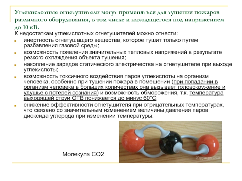 возможность токсичного воздействия паров углекислоты на организм человека, особенно при тушении пожара в помещении (при попадании в организм человека в больших количествах она вызывает головокружение и удушье с потерей сознания) и возможность обморожения, т.к. температура выходящей струи ОТВ понижается до минус 60°С;
