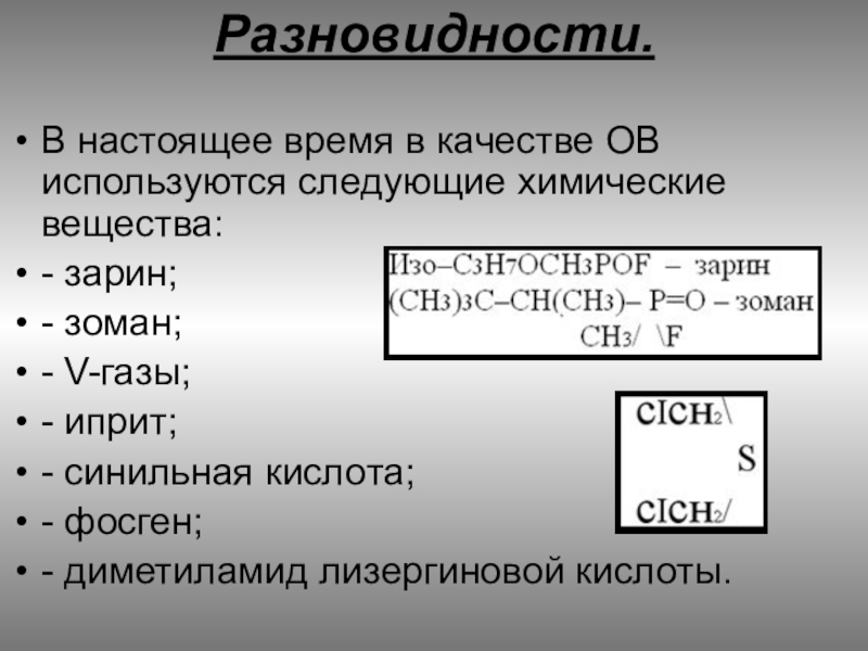 В настоящее время в качестве ОВ используются следующие химические вещества: