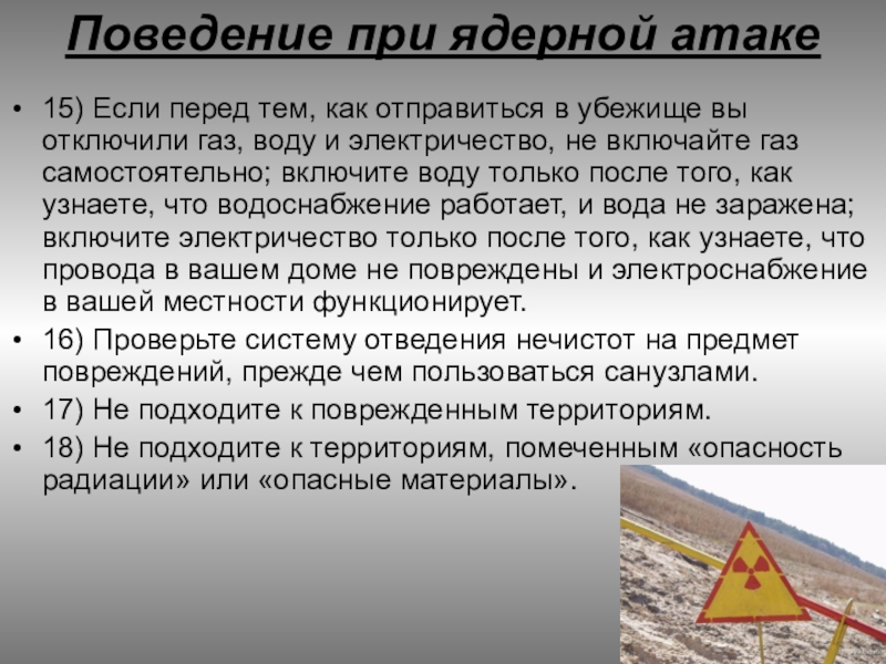 18) Не подходите к территориям, помеченным «опасность радиации» или «опасные материалы».