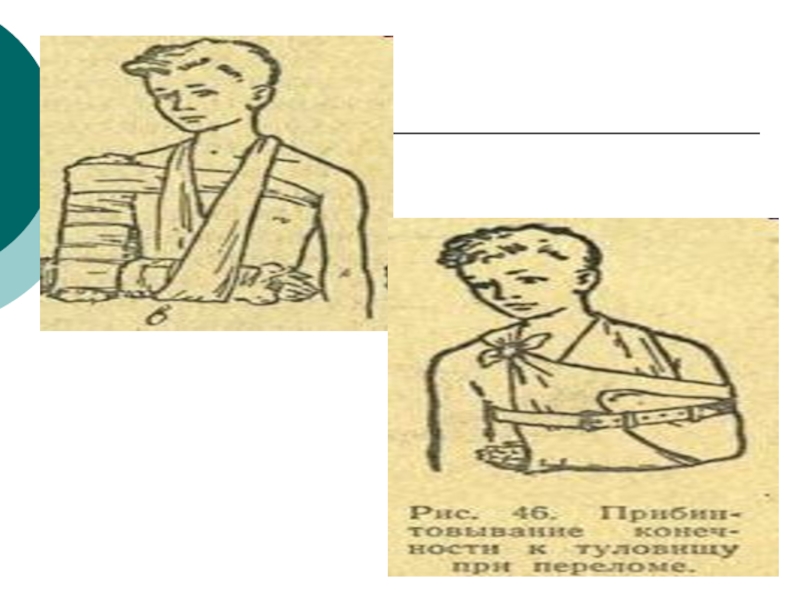 Если нет материала для шин, то можно, например при повреждении руки, подвесить ее, использовав для этой цели полу пиджака, или, согнув в локте, прибинтовать руку к туловищу.