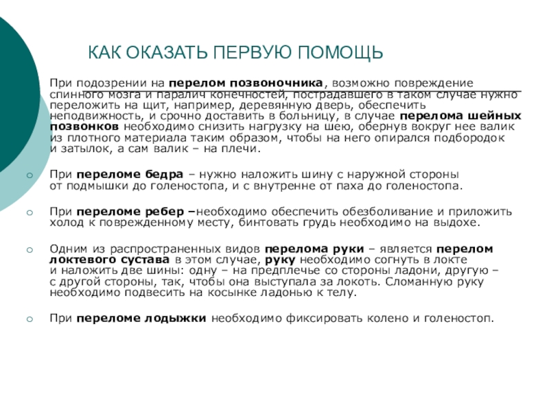 Первая помощь при переломах костей должна включать остановку кровотечения, обезболивание,