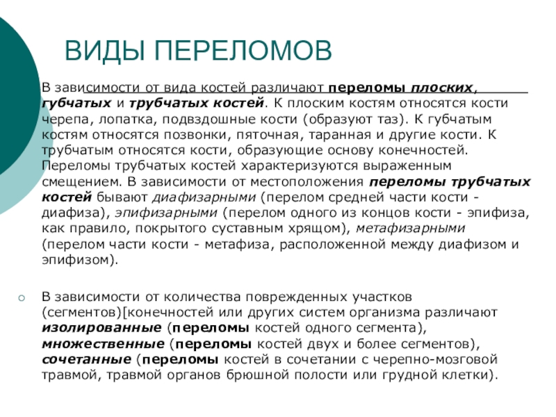 трубчатых костей. К плоским костям относятся кости черепа, лопатка, подвздошные кости (образуют таз). К губчатым костям относятся позвонки, пяточная, таранная и другие кости. К трубчатым относятся кости, образующие основу конечностей. Переломы трубчатых костей характеризуются выраженным смещением. В зависимости от местоположения переломы трубчатых костей бывают диафизарными (перелом средней части кости - диафиза), эпифизарными (перелом одного из концов кости - эпифиза, как правило, покрытого суставным хрящом), метафизарными (перелом части кости - метафиза, расположенной между диафизом и эпифизом).