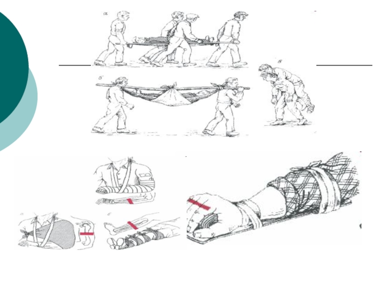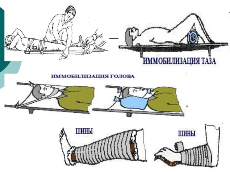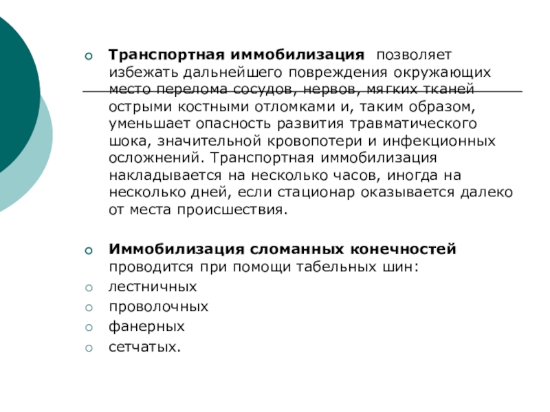 мягких тканей острыми костными отломками и, таким образом, уменьшает опасность развития травматического шока, значительной кровопотери и инфекционных осложнений. Транспортная иммобилизация накладывается на несколько часов, иногда на несколько дней, если стационар оказывается далеко от места происшествия.