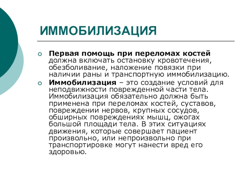 Иммобилизация – это создание условий для неподвижности поврежденной части тела. Иммобилизация обязательно должна быть применена при переломах костей, суставов, повреждении нервов, крупных сосудов, обширных повреждениях мышц, ожогах большой площади тела. В этих ситуациях движения, которые совершает пациент произвольно, или непроизвольно при транспортировке могут нанести вред его здоровью.