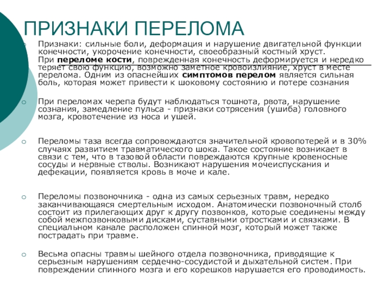 При переломе кости, поврежденная конечность деформируется и нередко теряет свою функцию, возможно заметное кровоизлияние, хруст в месте перелома. Одним из опаснейших симптомов перелом является сильная боль, которая может привести к шоковому состоянию и потере сознания