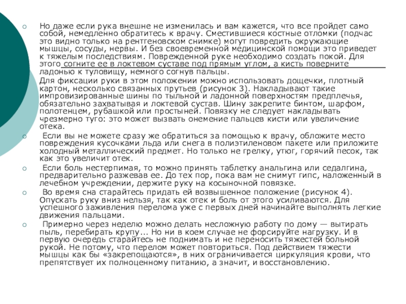 все пройдет само собой, немедленно обратитесь к врачу. Сместившиеся костные отломки (подчас это видно только на рентгеновском снимке) могут повредить окружающие мышцы, сосуды, нервы. И без своевременной медицинской помощи это приведет к тяжелым последствиям. Поврежденной руке необходимо создать покой. Для этого согните ее в локтевом суставе под прямым углом, а кисть поверните ладонью к туловищу, немного согнув пальцы.