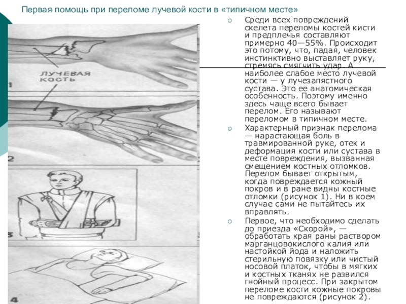 Характерный признак перелома — нарастающая боль в травмированной руке, отек и деформация кости или сустава в месте повреждения, вызванная смещением костных отломков. Перелом бывает открытым, когда повреждается кожный покров и в ране видны костные отломки (рисунок 1). Ни в коем случае сами не пытайтесь их вправлять.