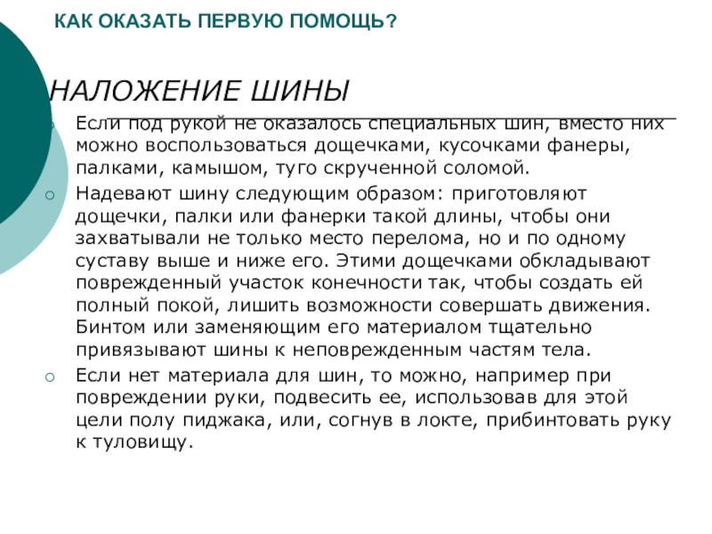 специальных шин, вместо них можно воспользоваться дощечками, кусочками фанеры, палками, камышом, туго скрученной соломой.