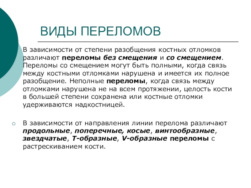 смещения и со смещением. Переломы со смещением могут быть полными, когда связь между костными отломками нарушена и имеется их полное разобщение. Неполные переломы, когда связь между отломками нарушена не на всем протяжении, целость кости в большей степени сохранена или костные отломки удерживаются надкостницей.