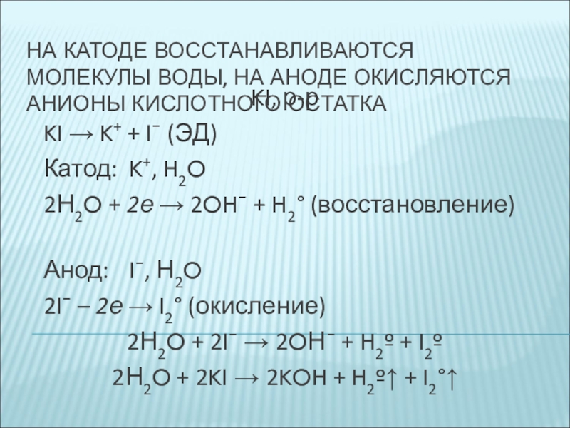 Слайд 11НА КАТОДЕ ВОССТАНАВЛИВАЮТСЯ МОЛЕКУЛЫ ВОДЫ, НА АНОДЕ ОКИСЛЯЮТСЯ АНИОНЫ КИСЛОТНОГО ОСТАТКА