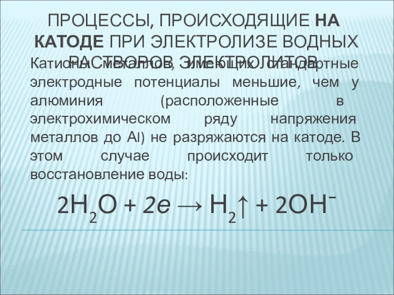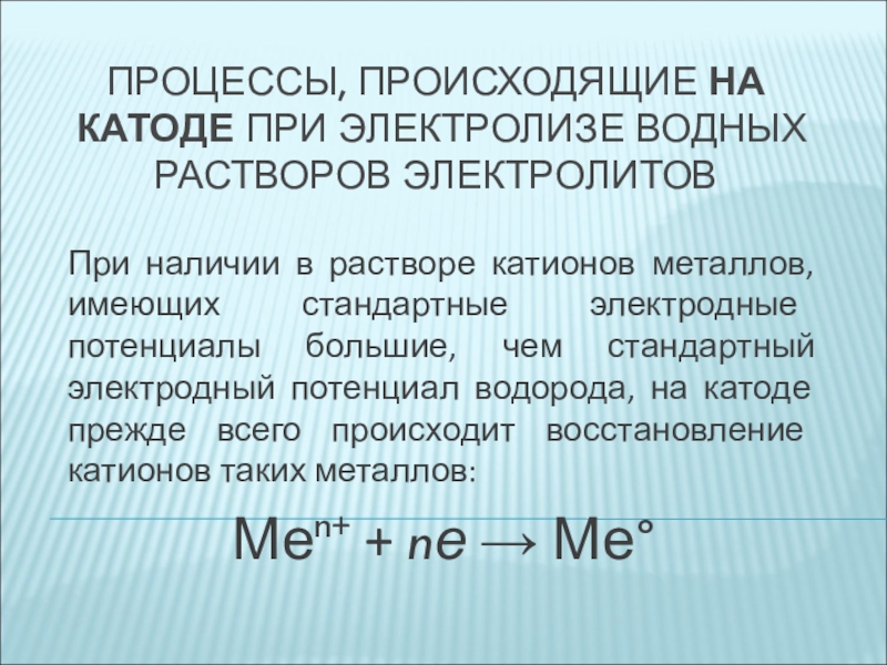 Слайд 7ПРОЦЕССЫ, ПРОИСХОДЯЩИЕ НА КАТОДЕ ПРИ ЭЛЕКТРОЛИЗЕ ВОДНЫХ РАСТВОРОВ ЭЛЕКТРОЛИТОВ