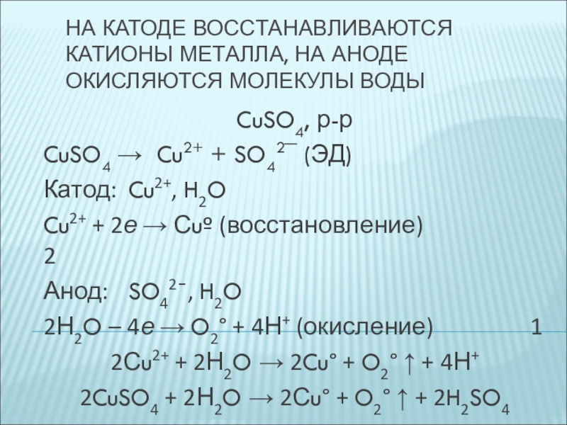 Слайд 12НА КАТОДЕ ВОССТАНАВЛИВАЮТСЯ КАТИОНЫ МЕТАЛЛА, НА АНОДЕ ОКИСЛЯЮТСЯ МОЛЕКУЛЫ ВОДЫ
