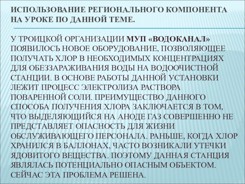 «ВОДОКАНАЛ» ПОЯВИЛОСЬ НОВОЕ ОБОРУДОВАНИЕ, ПОЗВОЛЯЮЩЕЕ ПОЛУЧАТЬ ХЛОР В НЕОБХОДИМЫХ КОНЦЕНТРАЦИЯХ ДЛЯ ОБЕЗЗАРАЖИВАНИЯ ВОДЫ НА ВОДООЧИСТНОЙ СТАНЦИИ. В ОСНОВЕ РАБОТЫ ДАННОЙ УСТАНОВКИ ЛЕЖИТ ПРОЦЕСС ЭЛЕКТРОЛИЗА РАСТВОРА ПОВАРЕННОЙ СОЛИ. ПРЕИМУЩЕСТВО ДАННОГО СПОСОБА ПОЛУЧЕНИЯ ХЛОРА ЗАКЛЮЧАЕТСЯ В ТОМ, ЧТО ВЫДЕЛЯЮЩИЙСЯ НА АНОДЕ ГАЗ СОВЕРШЕННО НЕ ПРЕДСТАВЛЯЕТ ОПАСНОСТЬ ДЛЯ ЖИЗНИ ОБСЛУЖИВАЮЩЕГО ПЕРСОНАЛА. РАНЬШЕ, КОГДА ХЛОР ХРАНИЛСЯ В БАЛЛОНАХ, ЧАСТО ВОЗНИКАЛИ УТЕЧКИ ЯДОВИТОГО ВЕЩЕСТВА. ПОЭТОМУ ДАННАЯ СТАНЦИЯ ЯВЛЯЛАСЬ ПОТЕНЦИАЛЬНО ОПАСНЫМ ОБЪЕКТОМ. СЕЙЧАС ЭТА ПРОБЛЕМА РЕШЕНА.