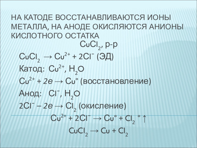 Слайд 10НА КАТОДЕ ВОССТАНАВЛИВАЮТСЯ ИОНЫ МЕТАЛЛА, НА АНОДЕ ОКИСЛЯЮТСЯ АНИОНЫ КИСЛОТНОГО ОСТАТКА