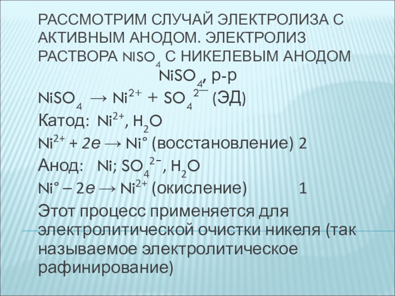 Слайд 15РАССМОТРИМ СЛУЧАЙ ЭЛЕКТРОЛИЗА С АКТИВНЫМ АНОДОМ. ЭЛЕКТРОЛИЗ РАСТВОРА NISO4 С НИКЕЛЕВЫМ