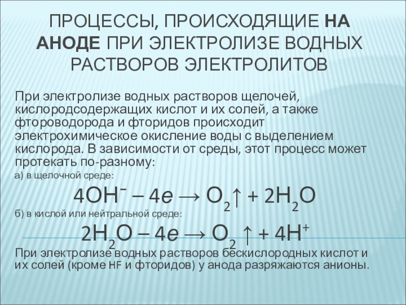 Слайд 9ПРОЦЕССЫ, ПРОИСХОДЯЩИЕ НА АНОДЕ ПРИ ЭЛЕКТРОЛИЗЕ ВОДНЫХ РАСТВОРОВ ЭЛЕКТРОЛИТОВ