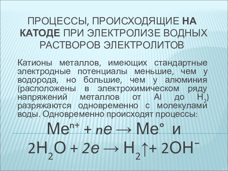 Слайд 8ПРОЦЕССЫ, ПРОИСХОДЯЩИЕ НА КАТОДЕ ПРИ ЭЛЕКТРОЛИЗЕ ВОДНЫХ РАСТВОРОВ ЭЛЕКТРОЛИТОВ
