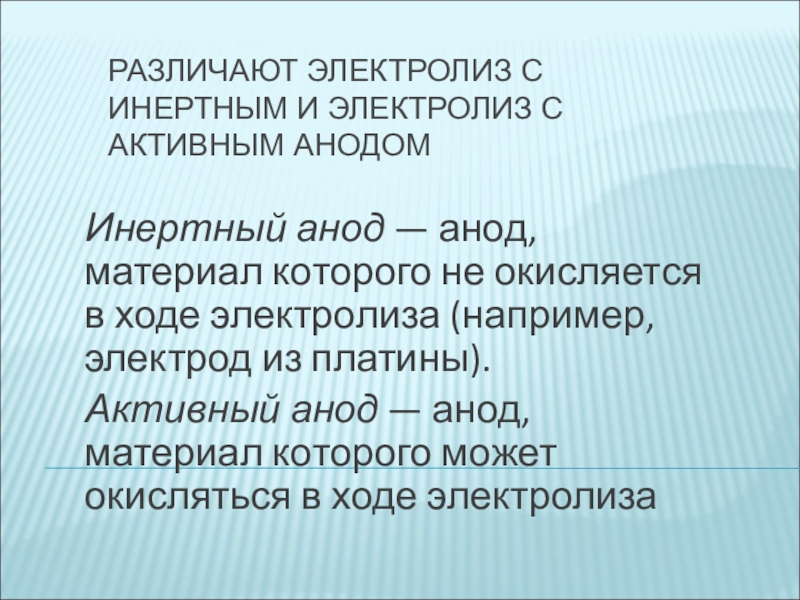 Слайд 14РАЗЛИЧАЮТ ЭЛЕКТРОЛИЗ С ИНЕРТНЫМ И ЭЛЕКТРОЛИЗ С АКТИВНЫМ АНОДОМ