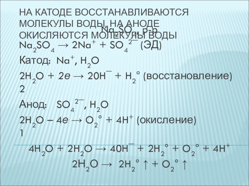 Слайд 13НА КАТОДЕ ВОССТАНАВЛИВАЮТСЯ МОЛЕКУЛЫ ВОДЫ, НА АНОДЕ ОКИСЛЯЮТСЯ МОЛЕКУЛЫ ВОДЫ