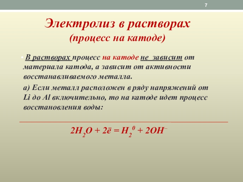 а) Если металл расположен в ряду напряжений от Li до Al включительно, то на катоде идет процесс восстановления воды: