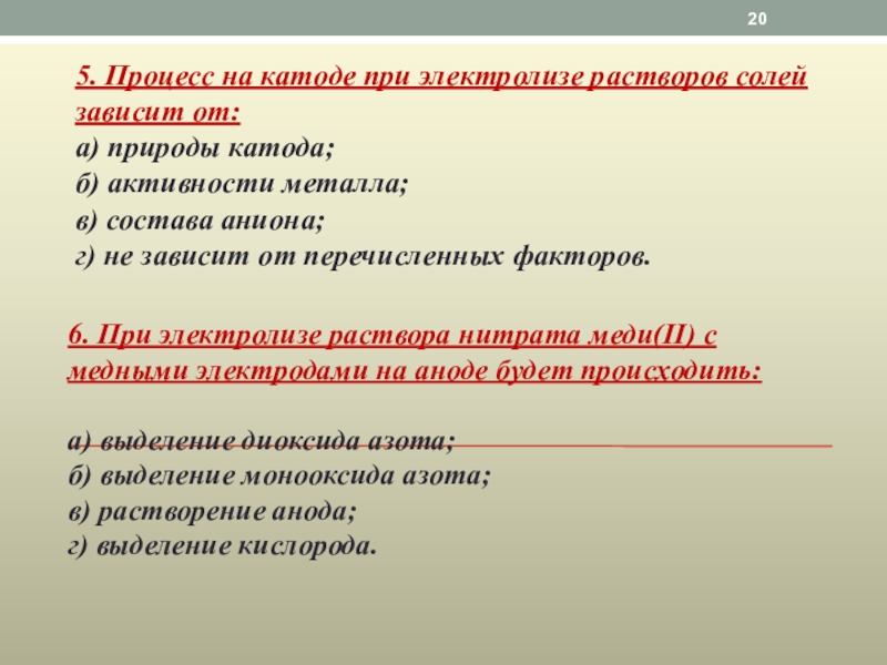 5. Процесс на катоде при электролизе растворов солей зависит от: