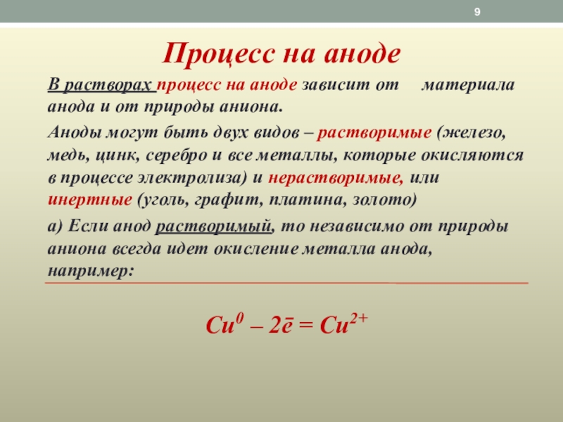 а) Если анод растворимый, то независимо от природы аниона всегда идет окисление металла анода, например: