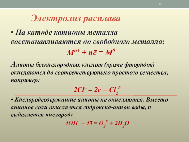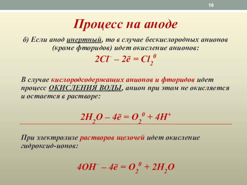 • Кислородсодержащие анионы не окисляются. Вместо анионов соли окисляется гидроксид-анион воды, и выделяется кислород: