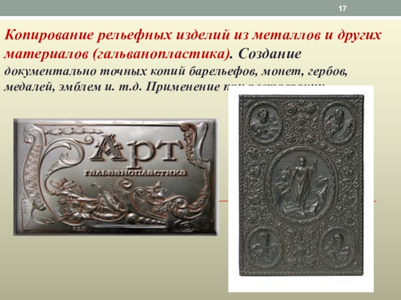 Слайд 17Копирование рельефных изделий из металлов и других материалов (гальванопластика). Создание документально
