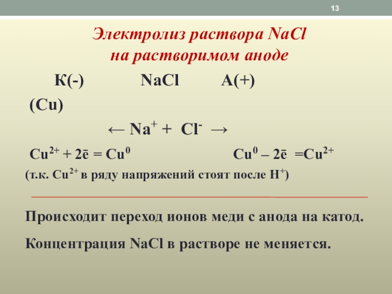 Происходит переход ионов меди с анода на катод. Концентрация NaCl в растворе не меняется.