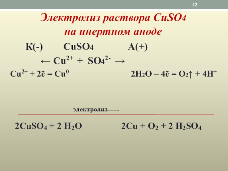 Cu2+ + 2ē = Cu0 2H2O – 4ē = O2↑ + 4H+