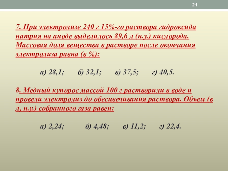 Слайд 217. При электролизе 240 г 15%-го раствора гидроксида натрия на аноде