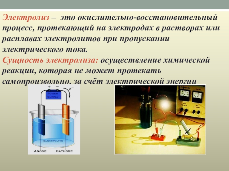 Сущность электролиза: осуществление химической реакции, которая не может протекать самопроизвольно, за счёт электрической энергии