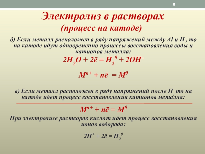 б) Если металл расположен в ряду напряжений между Al и H , то на катоде идут одновременно процессы восстановления воды и катионов металла: