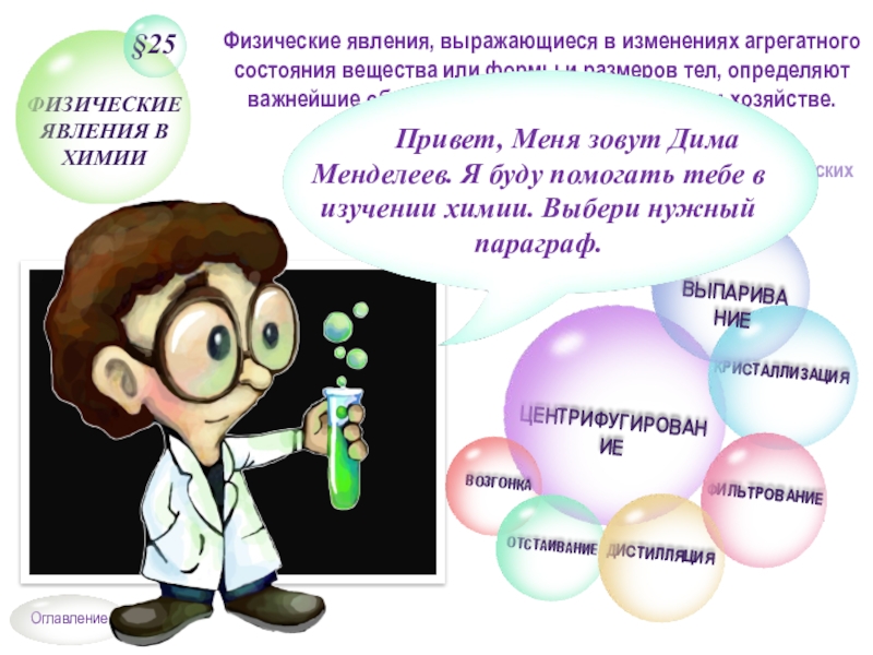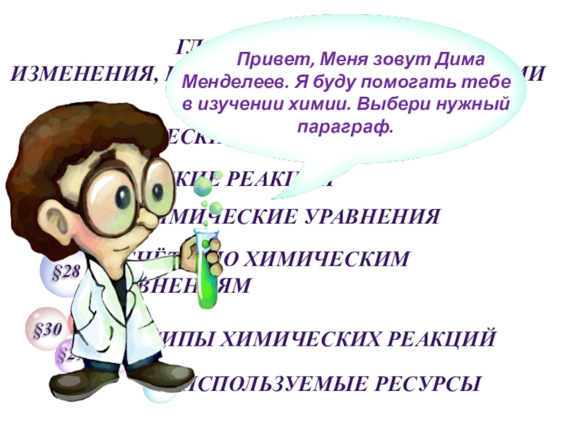Привет, Меня зовут Дима Менделеев. Я буду помогать тебе в изучении химии. Выбери нужный параграф.