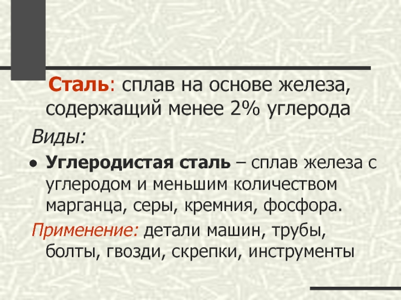 Слайд 16 Сталь: сплав на основе железа, содержащий менее 2% углерода