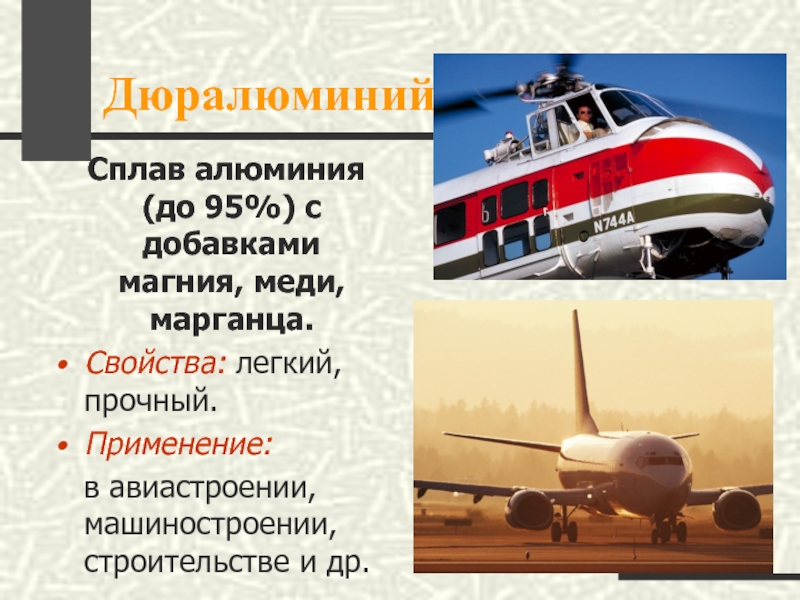 Сплав алюминия (до 95%) с добавками магния, меди, марганца.