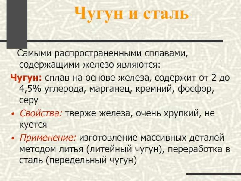 на основе железа, содержит от 2 до 4,5% углерода, марганец, кремний, фосфор, серу