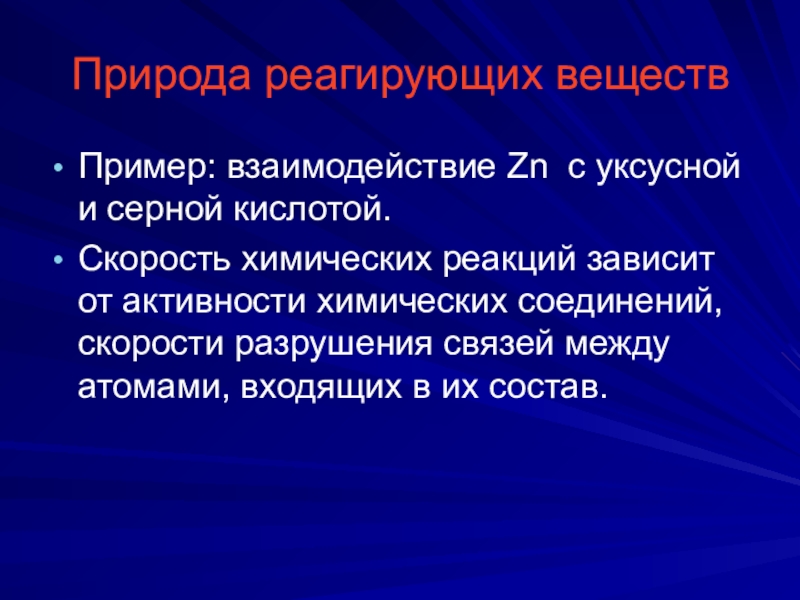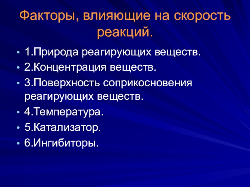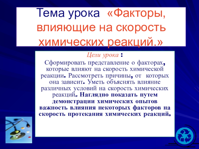 представление о факторах, которые влияют на скорость химической реакции. Рассмотреть причины, от которых она зависит. Уметь объяснять влияние различных условий на скорость химических реакций. Наглядно показать путем демонстрации химических опытов важность влияния некоторых факторов на скорость протекания химических реакций.