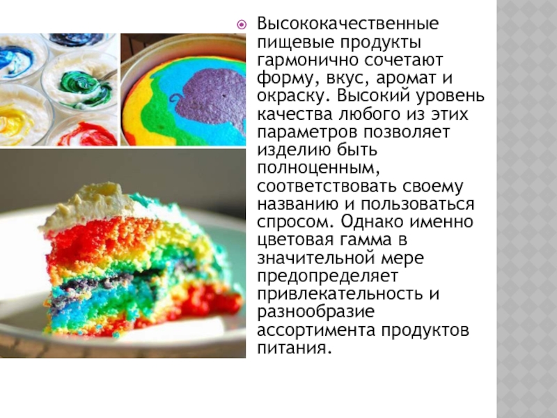 Слайд 2Высококачественные пищевые продукты гармонично сочетают форму, вкус, аромат и окраску. Высокий