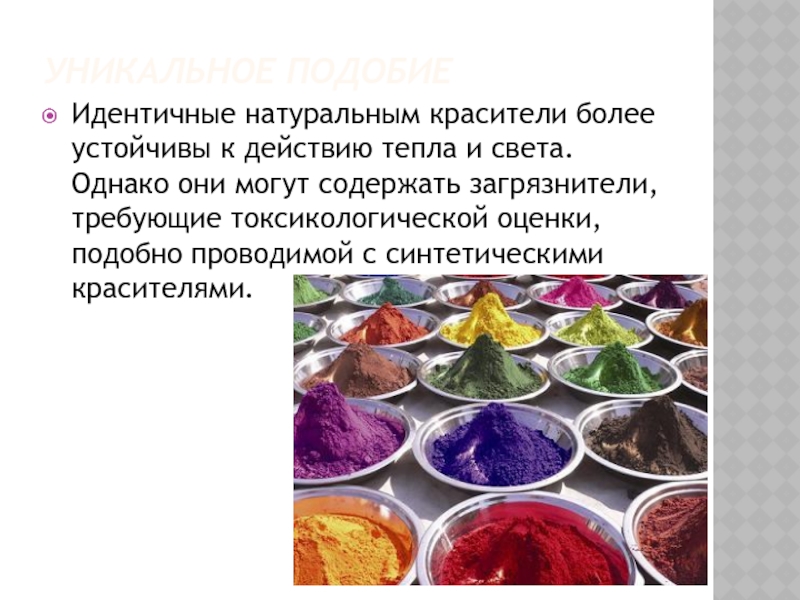 Идентичные натуральным красители более устойчивы к действию тепла и света.