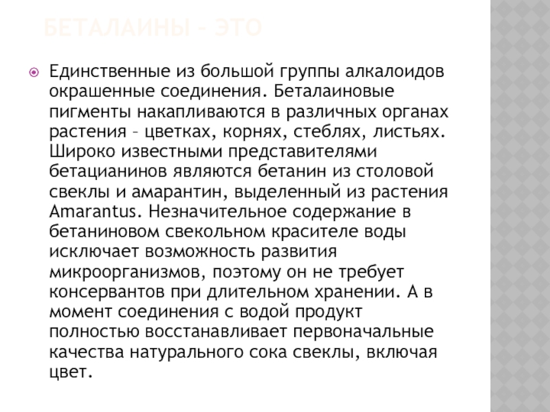 Единственные из большой группы алкалоидов окрашенные соединения. Беталаиновые