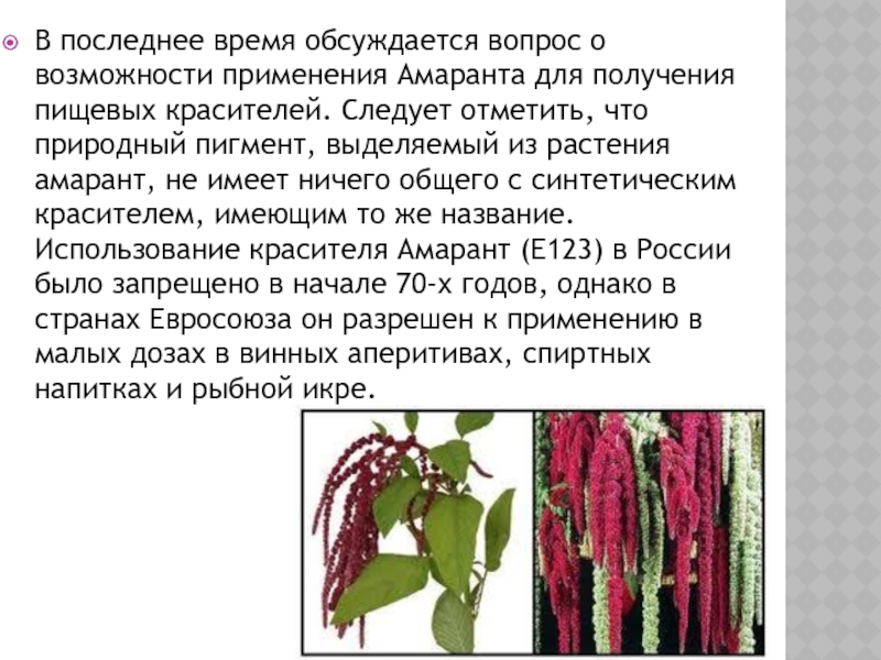пищевых красителей. Следует отметить, что природный пигмент, выделяемый из растения амарант, не имеет ничего общего с синтетическим красителем, имеющим то же название. Использование красителя Амарант (Е123) в России было запрещено в начале 70-х годов, однако в странах Евросоюза он разрешен к применению в малых дозах в винных аперитивах, спиртных напитках и рыбной икре.