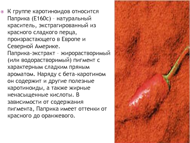 Слайд 13К группе каротиноидов относится Паприка (Е160с) – натуральный краситель, экстрагированный из