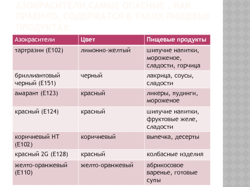 Слайд 19Азокрасители,самые опасные , как правило, содержатся в таких пищевых продуктах: