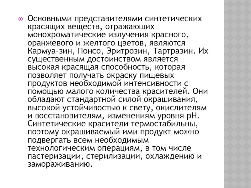 желтого цветов, являются Кармуа-зин, Понсо, Эритрозин, Тартразин. Их существенным достоинством является высокая красящая способность, которая позволяет получать окраску пищевых продуктов необходимой интенсивности с помощью малого количества красителей. Они обладают стандартной силой окрашивания, высокой устойчивостью к свету, окислителям и восстановителям, изменениям уровня pH. Синтетические красители термостабильны, поэтому окрашиваемый ими продукт можно подвергать всем необходимым технологическим операциям, в том числе пастеризации, стерилизации, охлаждению и замораживанию.