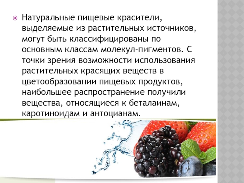 основным классам молекул-пигментов. С точки зрения возможности использования растительных красящих веществ в цветообразовании пищевых продуктов, наибольшее распространение получили вещества, относящиеся к беталаинам, каротиноидам и антоцианам.