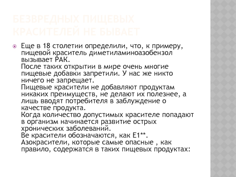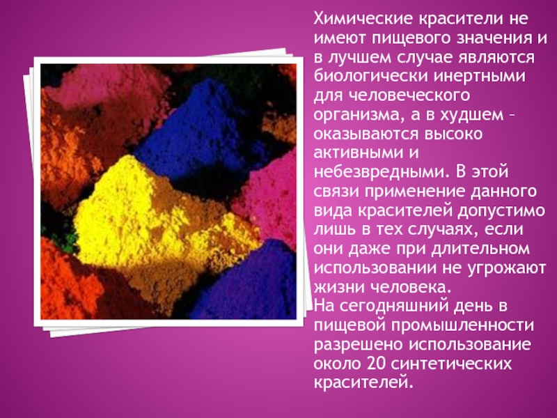 Слайд 7Химические красители не имеют пищевого значения и в лучшем случае являются