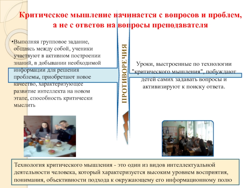 Именно поэтому организация учебного процесса, связанная с развитием склонностей к критическому мышлению, представляется нам инструментом, который позволяет разрешить противоречия между консервативными установками традиционного образования и авангардными идеями, позволит в большей степени реализовать педагогические задачи, поставленные в связи с развитием новых стандартов в образовании.